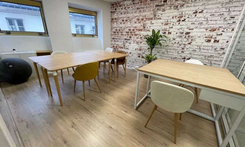 L'espace est composé de 4 parties de 12m² chacune, ainsi que d'une dépendance. Il y a une grande entrée avec canapé et table basse, une salle de réunion avec TV et deux espaces bureau pouvant accueillir en tout 10 postes. Une kitchenette se trouve dans la dépendance pour que vous puissiez vous y détendre et faire une pause.
